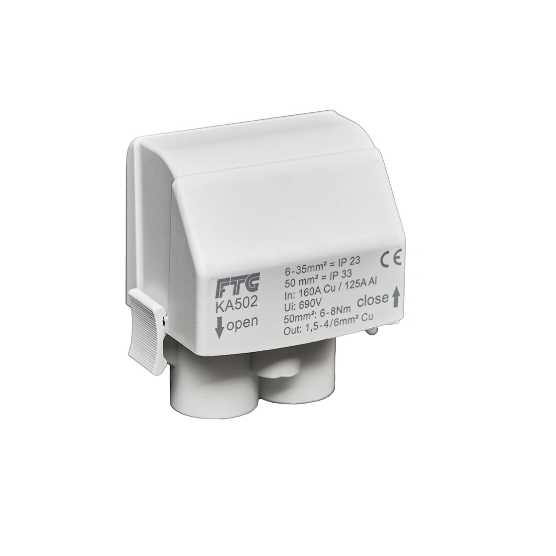 Plintarna är helt beröringsskyddade med ett skjutbart lock och har en kapslingsklass om IP23 eller IP33 beroende på ansluten ledare. KA50 finns i två varianter med 2 eller 3 anslutningar för grövre ledare om 6-50 mm² och 1 eller 2 anslutningar för utgående ledare om 1,5-6 mm².
