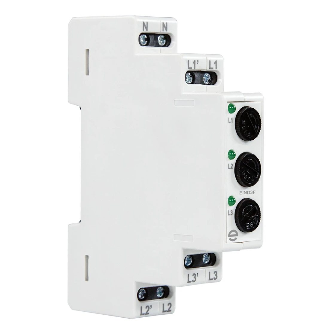 EIND3F är en kompakt och driftsäker fasindikator avsedd för 400 V, 3F+N. Produkten är utrustad med tre gröna LED-indikatorer som tydligt visar status för L1, L2 och L3. Varje fas skyddas av en utbytbar 6,3 A glasrörssäkring (5x20 mm), vilket ger ett pålitligt skydd för både LED-dioderna och eventuellt anslutna komponenter.