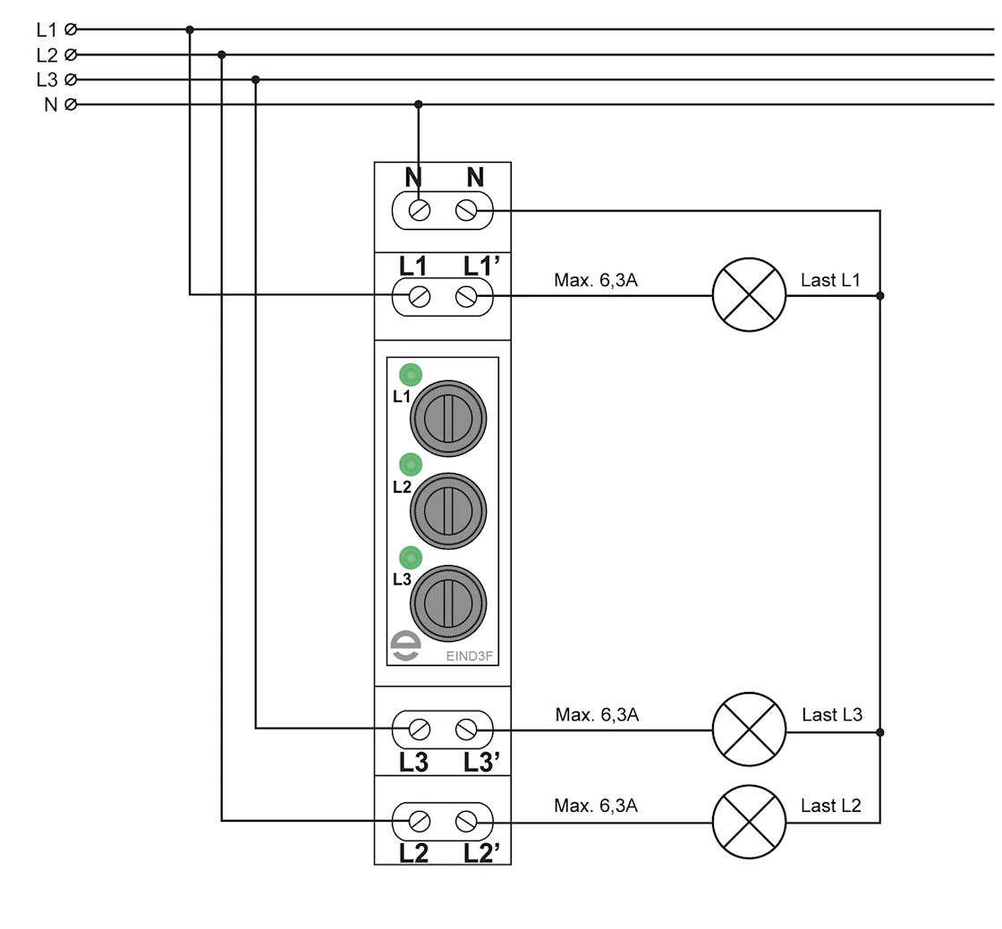 Via separata anslutningsplintar på fronten kan EIND3F även fungera som säkringsskydd för extern styr-, mät- eller kontrollutrustning. Den är därför ett flexibelt val för elcentraler, elfördelningar, mätarskåp samt styr- och automationssystem där tydlig fasindikering och säker driftsättning är viktigt.