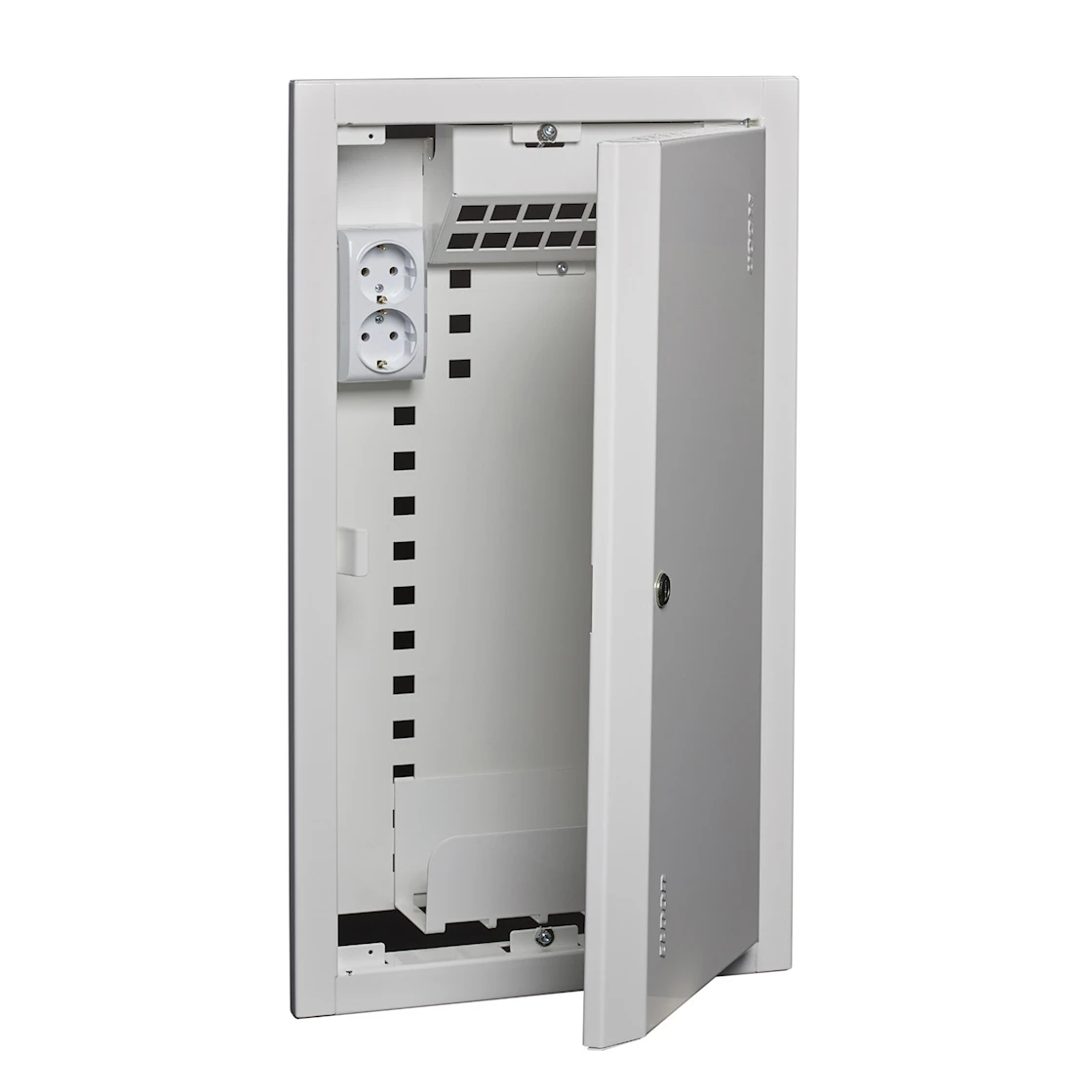 Mediacentralen är en stabil central helt i plåt. Dörren är ventilerad i över- och underkant för att leda bort så mycket värme som möjligt från centralen. Dörren har snabbfästen som gångjärn för att enkelt kunna tas bort vid behov och är även vändbar för höger- eller vänsterhängning.