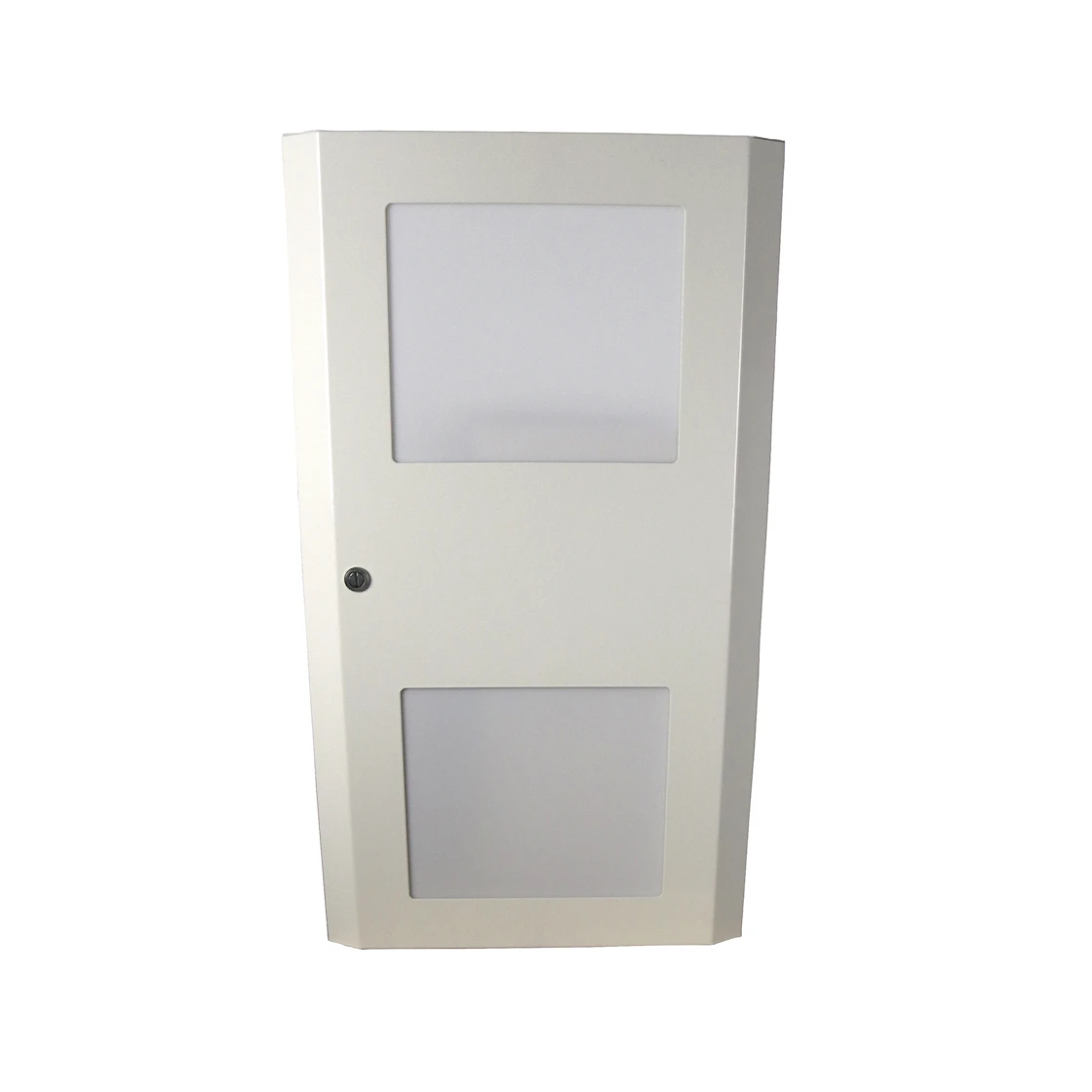 Dörr i plåt med fönster i vitfrostad ABS-plast för bättre signalgenomgång.